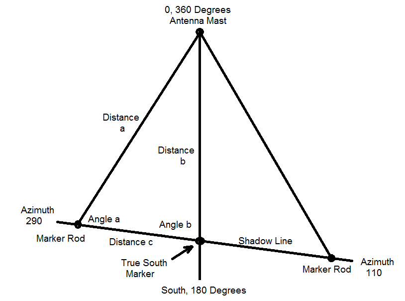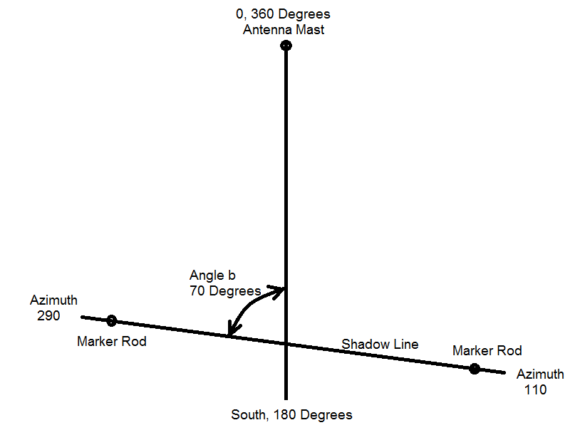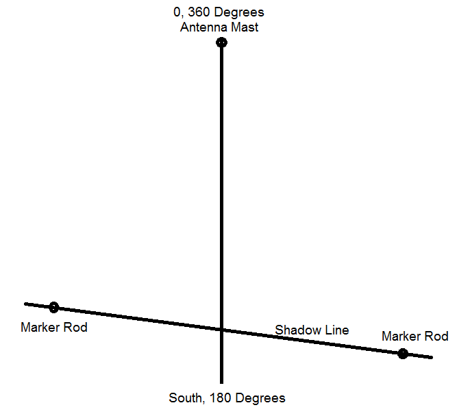 In the early morning or late afternoon, lay out a shadow line that crosses a point about 15 feet south of your antenna mast. Mark the shadow with two little metal rods. Note the exact time when you mark the shadow. To make a shadow you could stand up a 2x4 piece of lumber and hold it plumb/vertical. Use a carpenters level.